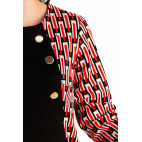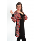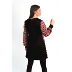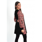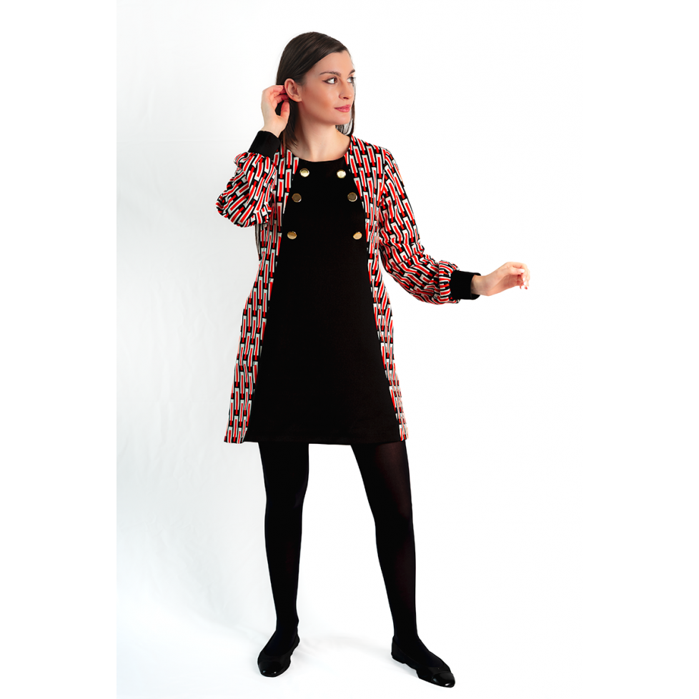Excepcional vestido de mujer, con estampado original y exclusivo de nuestra firma. Tenemos que destacar su corte a la altura de la cadera que estiliza muchísimo así como su corte trapecio. Destacamos también su contraste de tejidos en la falda y mangas así como detalle de tapetes en la falda y botón en contraste.